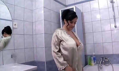 kinky cougar frota sus ubres ginormous en una bañera elástica jabonosa